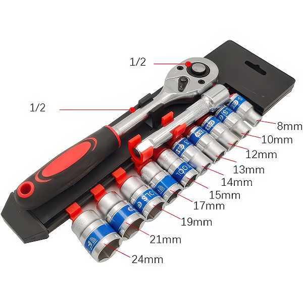 Комплетот вклучува 12 приклучни клучеви со различни големини, што ви овозможува да ракувате со завртки со различни димензии и за различни намени. Сите клучеви се дизајнирани да задоволат широк спектар на потреби, од поправки во домот до професионални задачи.