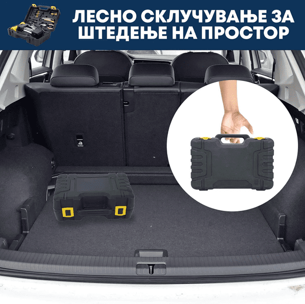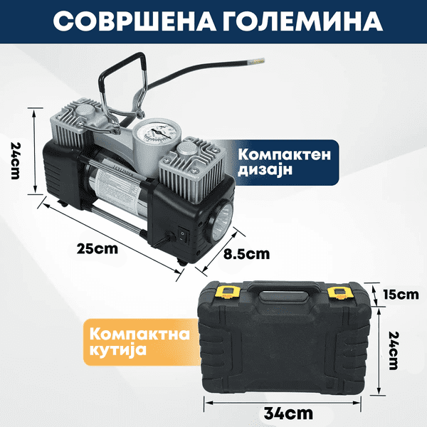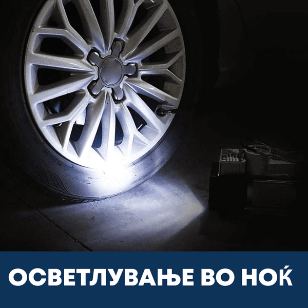 ✅ Преносливост - Со компактен дизајн и способност да се напојува преку приклучокот од 12V во твојот автомобил, овој компресор е идеален за носење во возилото, без разлика дали одиш на долги патувања или едноставно сакаш да бидеш подготвен за неочекувани ситуации.