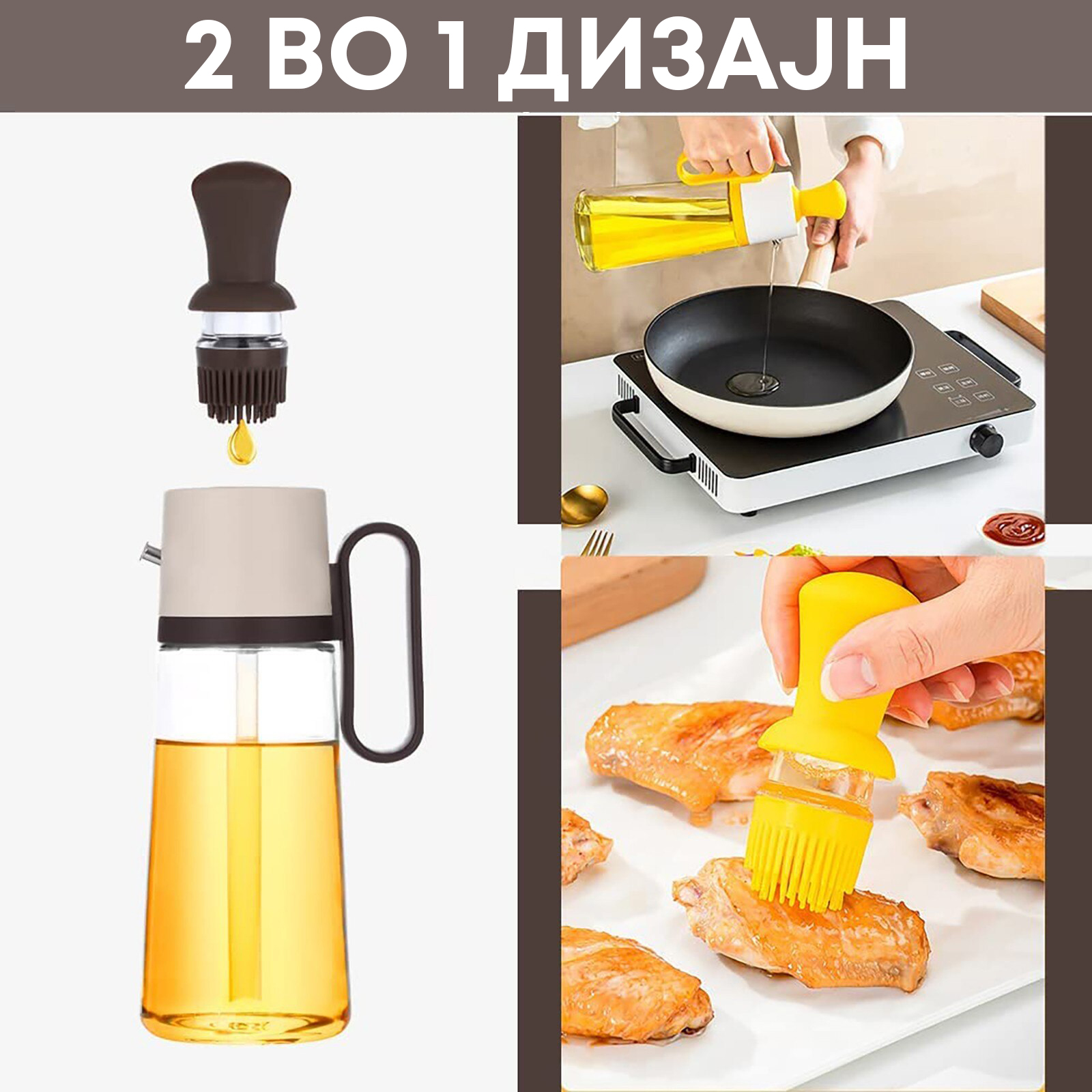 Подобри ги твоите кулинарски вештини и олесни ја подготовката на храната со нашиот иновативен 2 во 1 дозер. Овој практичен производ комбинира две функции во една, што ти дава не само можност за прецизно дозирање на маслото, туку и практичен начин на нанесување или маринирање на храната.