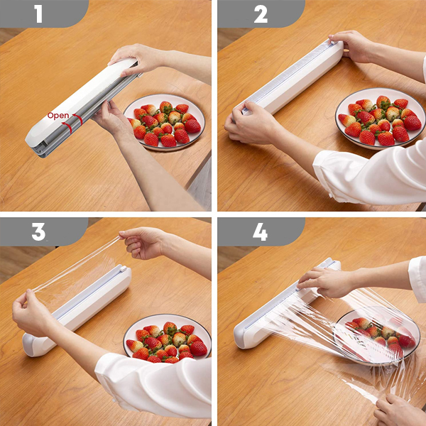 Практичен дизајн и лесна употреба- Стилско, едноставно, двонасочно копче за сечење. Извлечи ја саканата количина на фолија и движи го двонасочното копче за сечење, од лево кон десно или од десно кон лево.