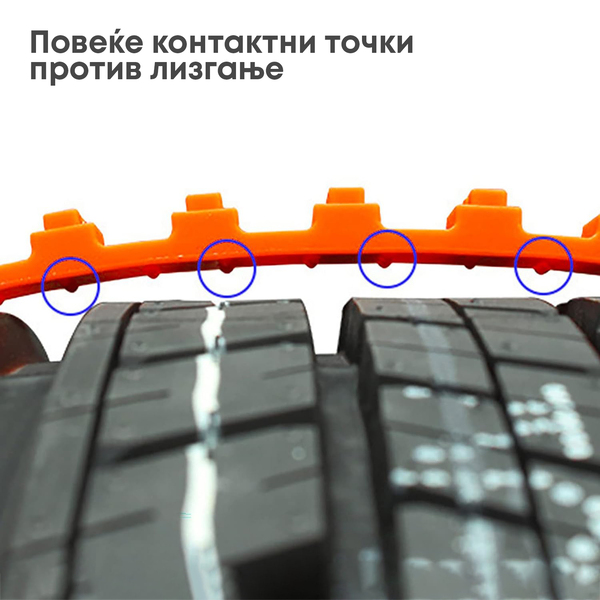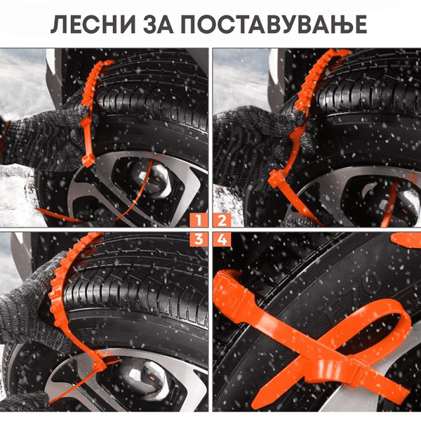 Овие пластични стеги се дизајнирани да обезбедат дополнително држење при возење на снег. Со поставување на овие стеги на тркалата на вашето возило, ја зголемувате тракцијата и го намалувате лизгањето, што овозможува побезбедно возење во зимски услови.
