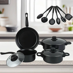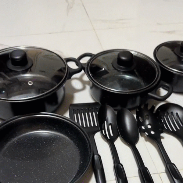 ✔️ Целосен комплет – Вклучува 13 парчиња, со сите основни тави, тенџериња и кујнски прибор.