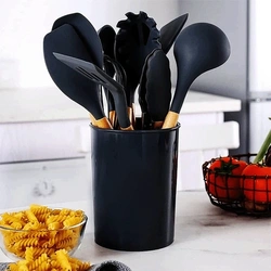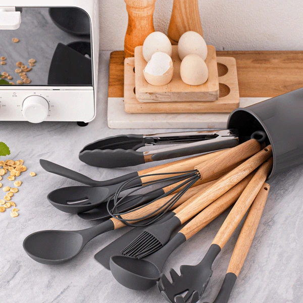 Со CookPro, добивате 12 суштински алатки кои ви се потребни за секое кулинарско ремек-дело – од шпатули и лажици до маталка и клешти. Силиконските глави на приборот се отпорни на многу високи температури до $230-250^\circ \text{C}$ и се апсолутно нежни кон вашите садови со нелеплива облога, спречувајќи гребење и продолжувајќи го нивниот век на траење. Овој прибор е изработен од силикон за храна BPA Free, што го прави безбеден и нетоксичен. Рачките се изработени од природно дрво бамбус или нерѓосувачки челик, обезбедувајќи ергономски зафат и модерен, стилски изглед во вашата кујна. Сетот вклучува и држач или корпа за уредно складирање на сите парчиња.
