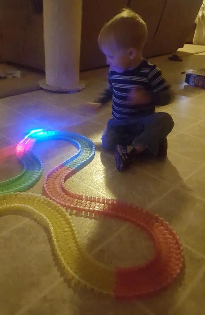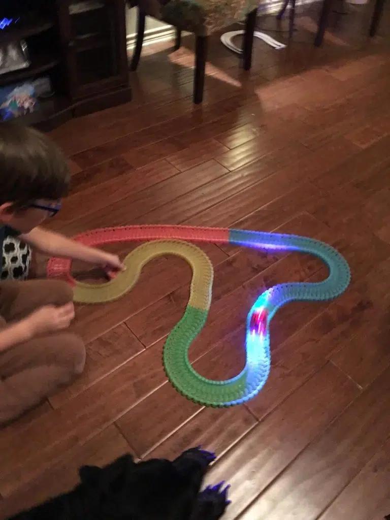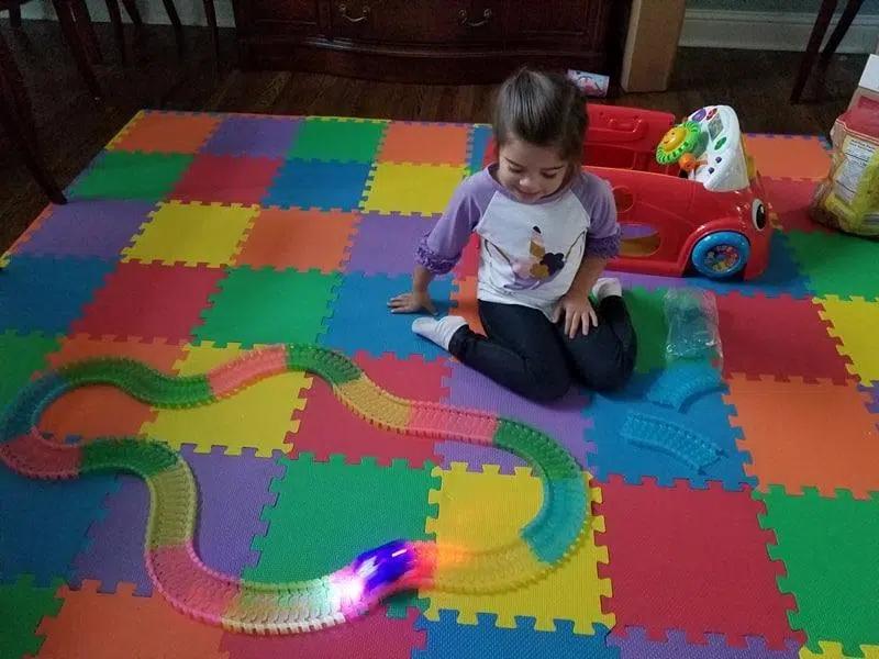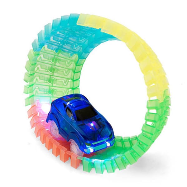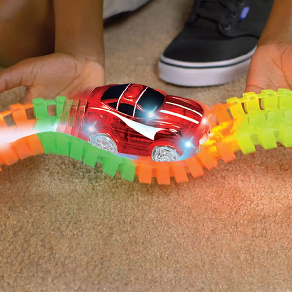 Патеката свети во мракот и има 4 весели бои, додека пак автомобилот има 4 ЛЕД сијалички кои прават вистинска забава во детската соба.
