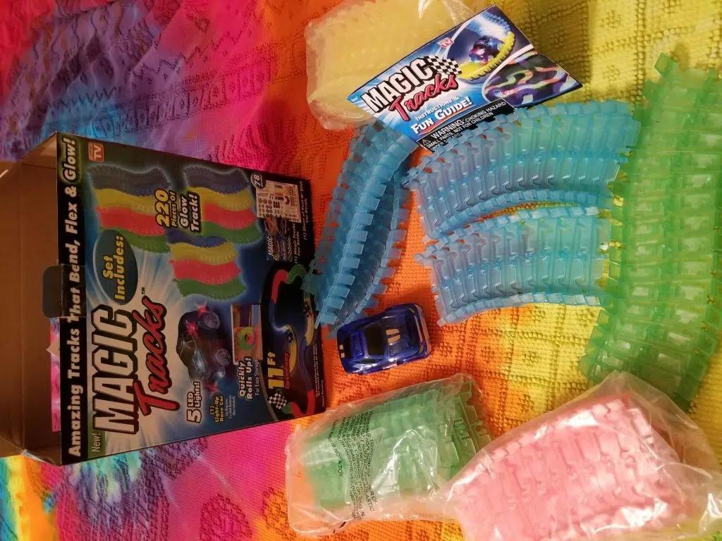 Направен е од проѕирен материјал и има 4 ЛЕД светилки. Автомобилот работи со 3ААА батерии. Сетот создава магија во собата кога ќе го изгасиш светлото. Веселите бои светат во мракот и твоите деца ќе уживаат во играта.