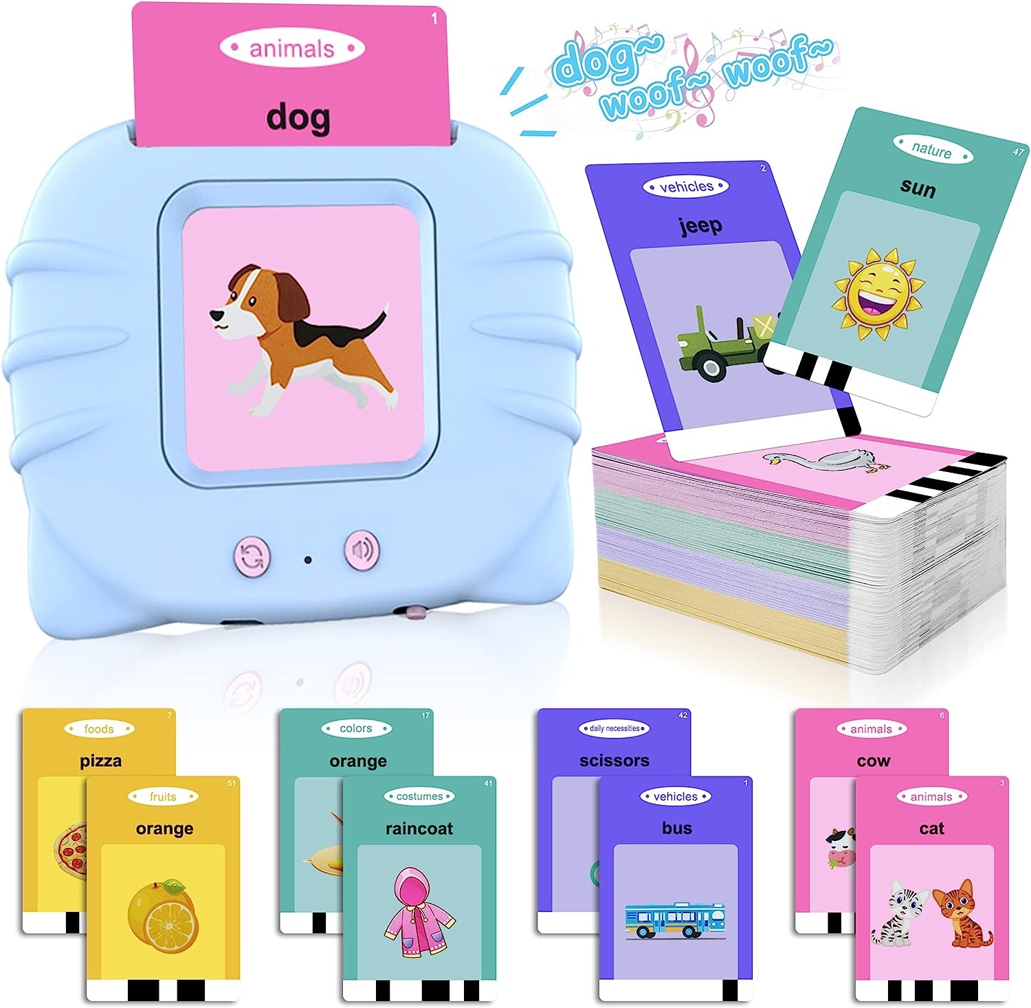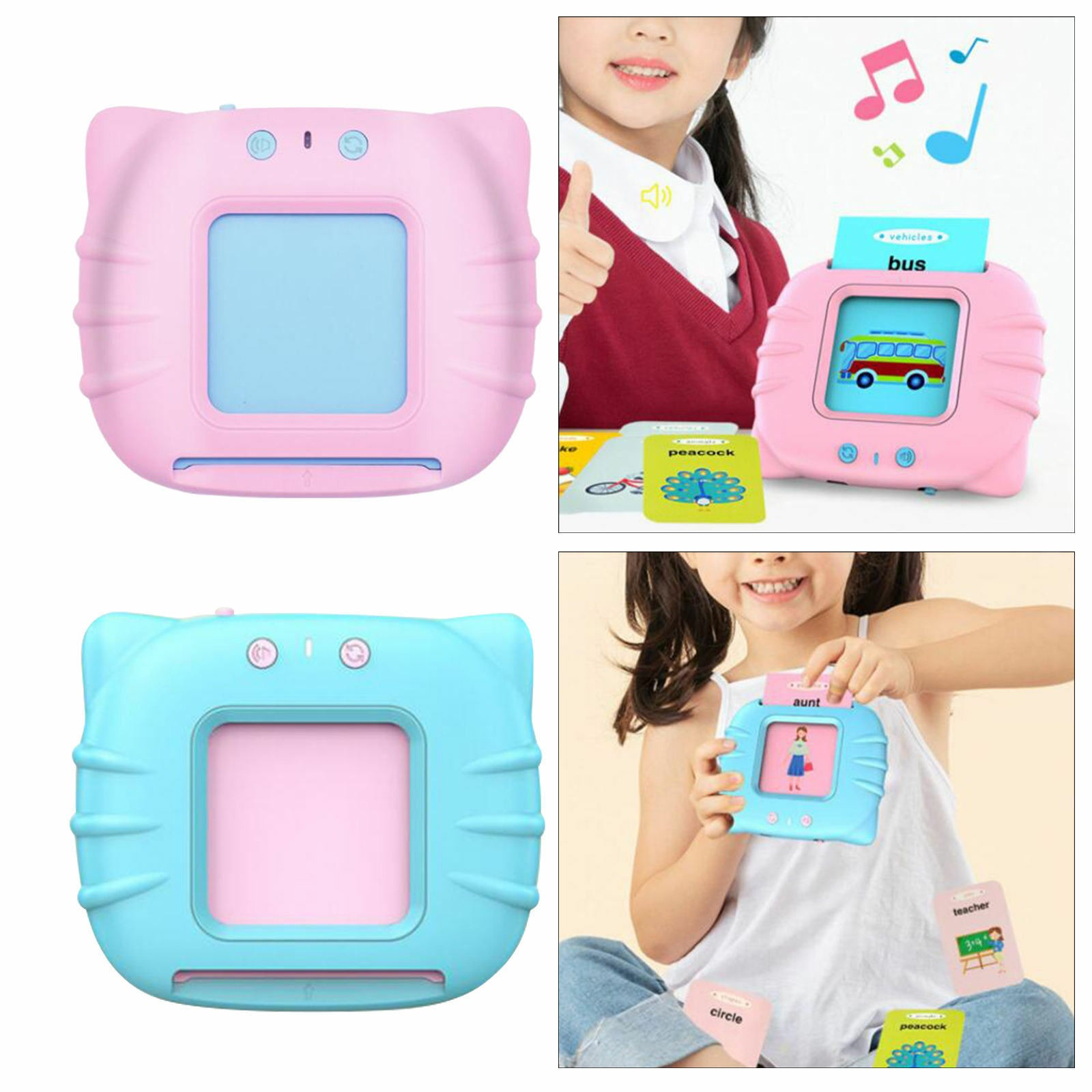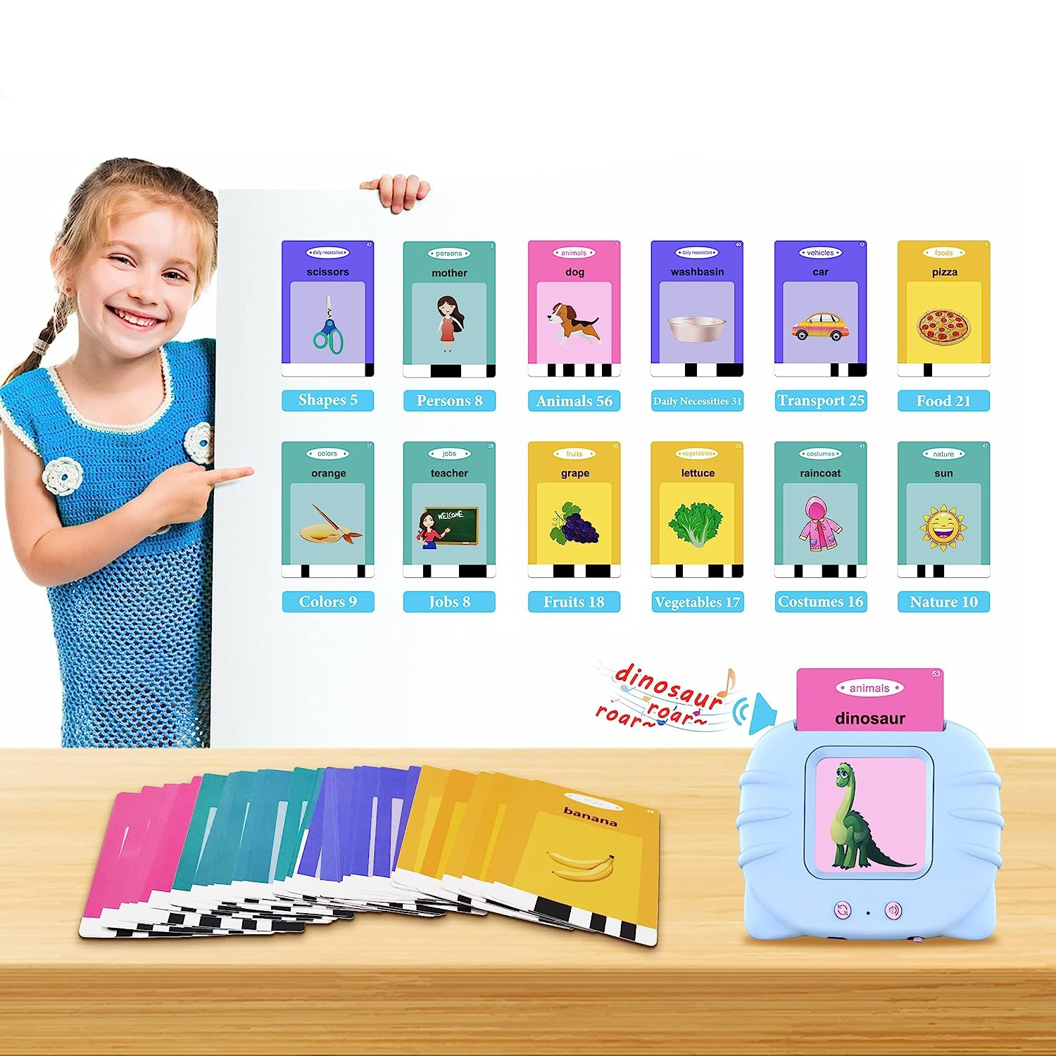 Секоја картичка е прекрасно илустрирана и содржи слика или концепт со име. Кога детето ќе го притисне копчето на апаратот во кој што претходно ќе ја стави картичката, апаратот ќе каже збор или ќе даде инструкција со јасен и пријателски глас. Ова им овозможува на децата да го слушнат правилниот изговор на зборовите и да научат како правилно да ги изговараат.
