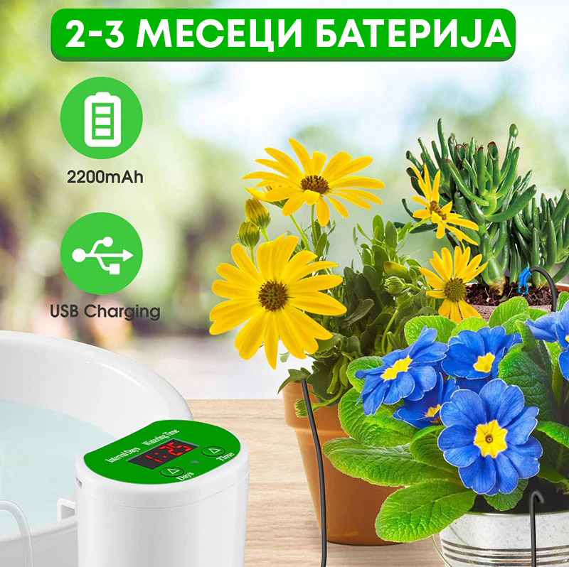 Лесен за употреба, брзо се поставува, само стави ги цевчињата во балон со вода за наводнување со едниот крај, а другиот во растенијата и притисни на копчето.