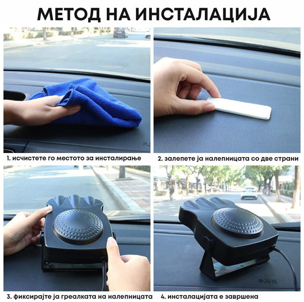 Употребата е едноставна. Приклучете го вентилаторот на грејачот во запалката на автомобилот, вклучете го и изберете го саканиот режим. По кратко време, ќе уживате во брзо и ефикасно одмрзнување или одмаглување на шофершајбната.