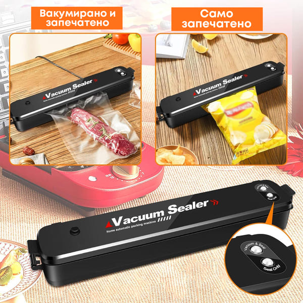Покрај вакуумирање на храната, овој уред ти овозможува херметичко запечатување на различни видови торбички и кеси. Корисно е за одржување на свежи закуски, зачини, кафе, чај и други производи.