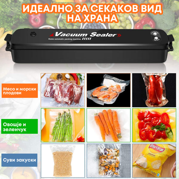 Овој уред е лесен за употреба и многу ефикасен. Можете да запечатите големи количества храна за брзо складирање.