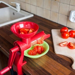 Машината е исклучително ефикасна за вадење сок од домати. Рачката лесно се врти, овозможувајќи ви да извлечете максимална количина сок од секој домат.