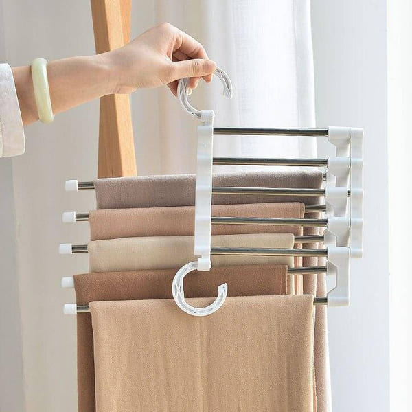 ✅ Максимална организација на гардеробата - Со закачалката за панталони 5-во-1, лесно ќе ја организираш твојата гардероба. Сега можеш да чуваш пет пара панталони на едно место, што ќе ти заштеди простор и време при изборот на облека.