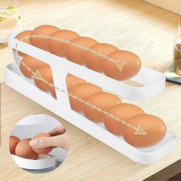 Благодарение на дното за тркалење, пристапот до јајцата станува едноставен и брз, без ризик од оштетување или кршење. Овој производ овозможува ефикасна организација на јајцата, чувајќи ги безбедни, а во исто време ја олеснува нивната употреба во секојдневната подготовка на оброците.