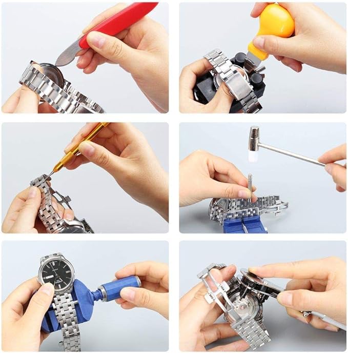 Овој професионален комплет за поправка на часовници ти овозможува лесно и ефикасно да ги решиш повеќето проблеми со твојот часовник без да одиш кај часовничар. Во сетот се вклучени алатки за отворање на задниот капак, заменување на батерии, прилагодување и скратување на ремчиња, отстранување на пружни шипки и поставување на нови заптивки.