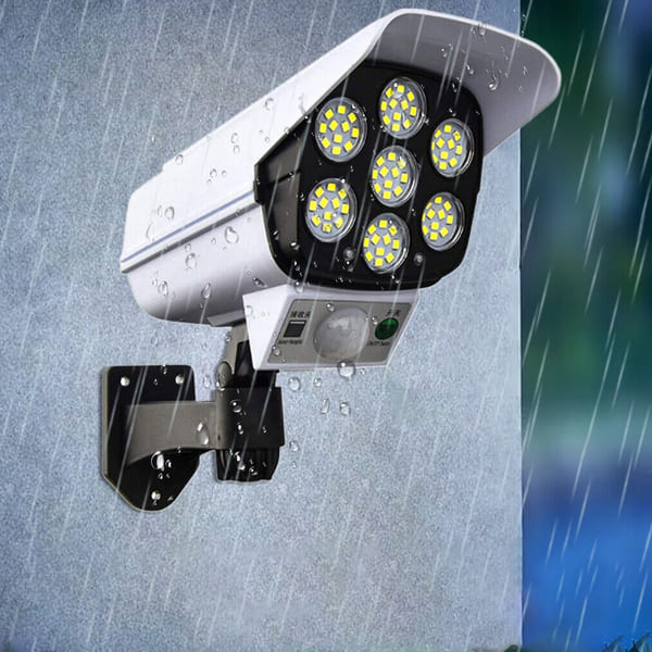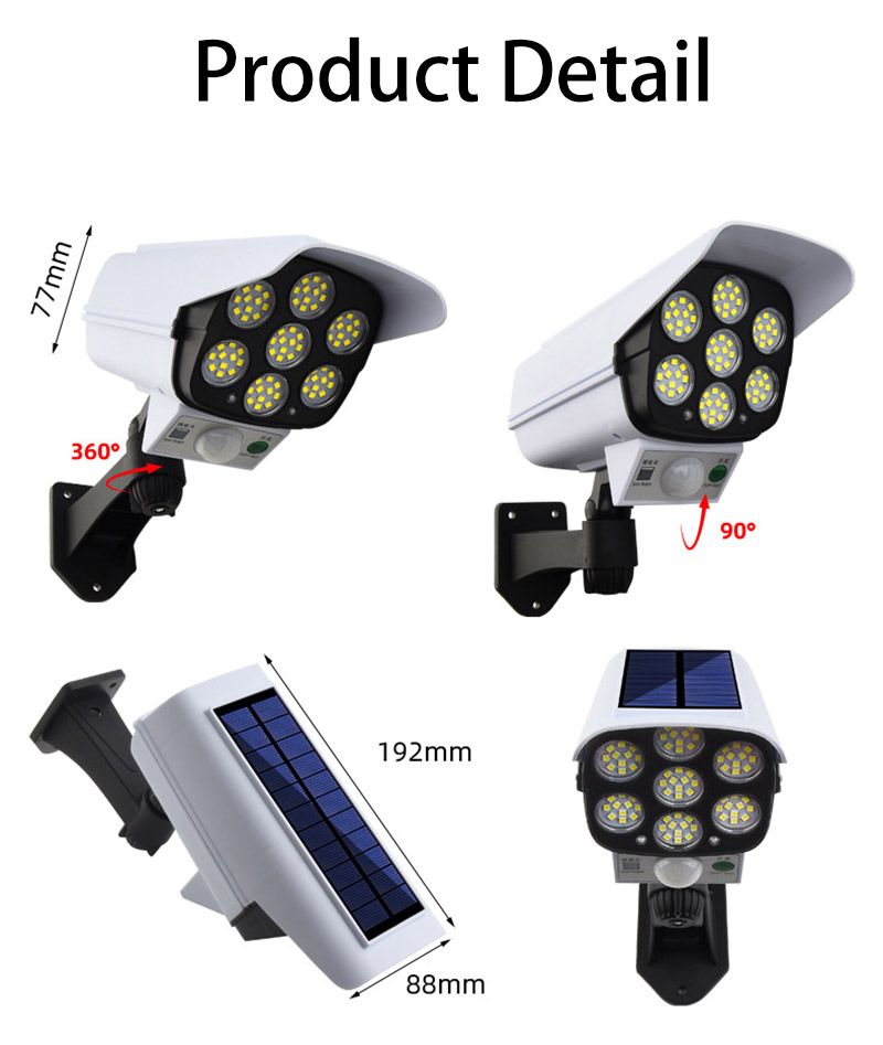 Овој соларен рефлектор во облик на камера е одличен безбедносен производ. Лесно се инсталира и автоматски се вклучува кога ќе се открие движење, зголемувајќи ја безбедноста на вашиот дом.