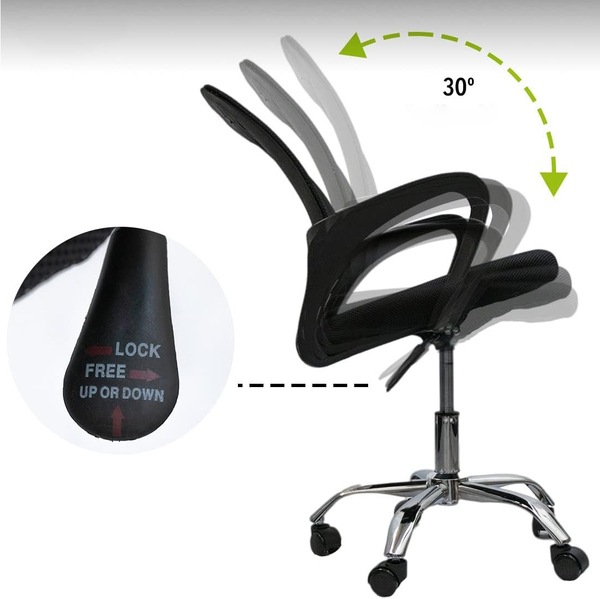 Мрежестиот заден дел на овој канцелариски стол обезбедува одлична вентилација и удобност за време на долгите работни часови. Овозможува проток на воздух, го спречува потењето и обезбедува поддршка за 'рбетот, што го прави совршен избор за продуктивен работен ден.